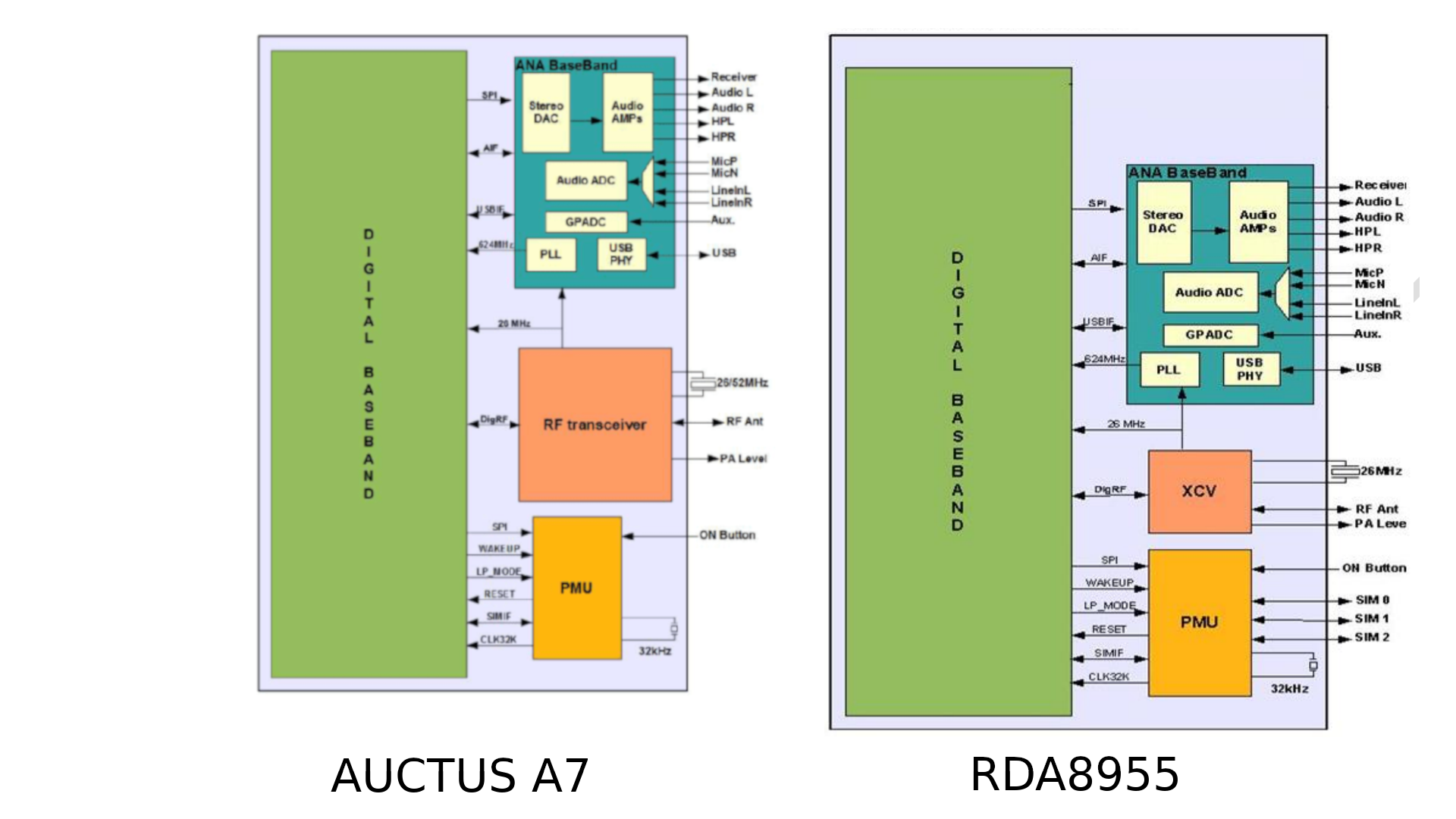 Working off the assumption that the A6 is like something from RDA, several RDA datasheets were collected. Based upon the datasheets for the RDA8851 and RDA88X9 and the files in the A9 repository, the RDA chips share several common features.