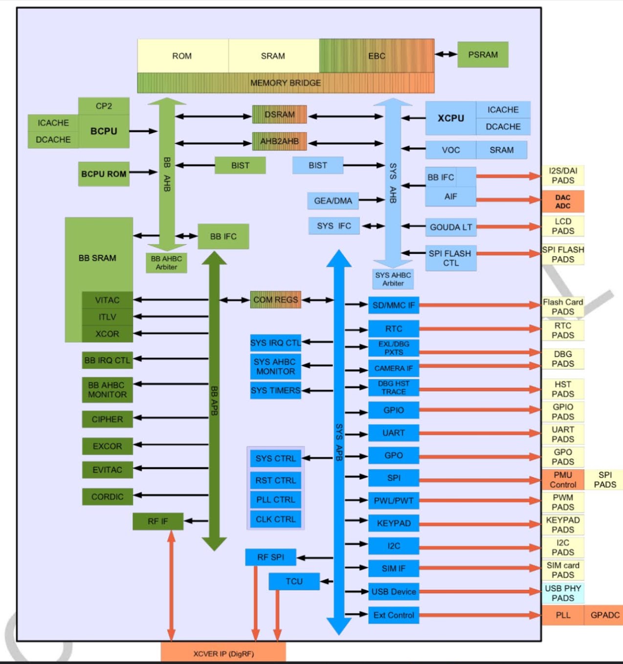 The BCPU (green side) controls the RF side of things. Think of it as a dedicated SDR. This side takes the I/Q samples and goes through the decoding and eventually sends the data to the XCPU side for output. It has to be encoded data as the vocoder is attached to the XCPU bus. Rather than being a second core and running general routines, the BCPU is a dedicated base band processor. The primary peripheral is the RFSPI IF DAC.
